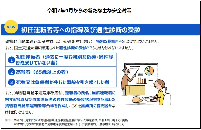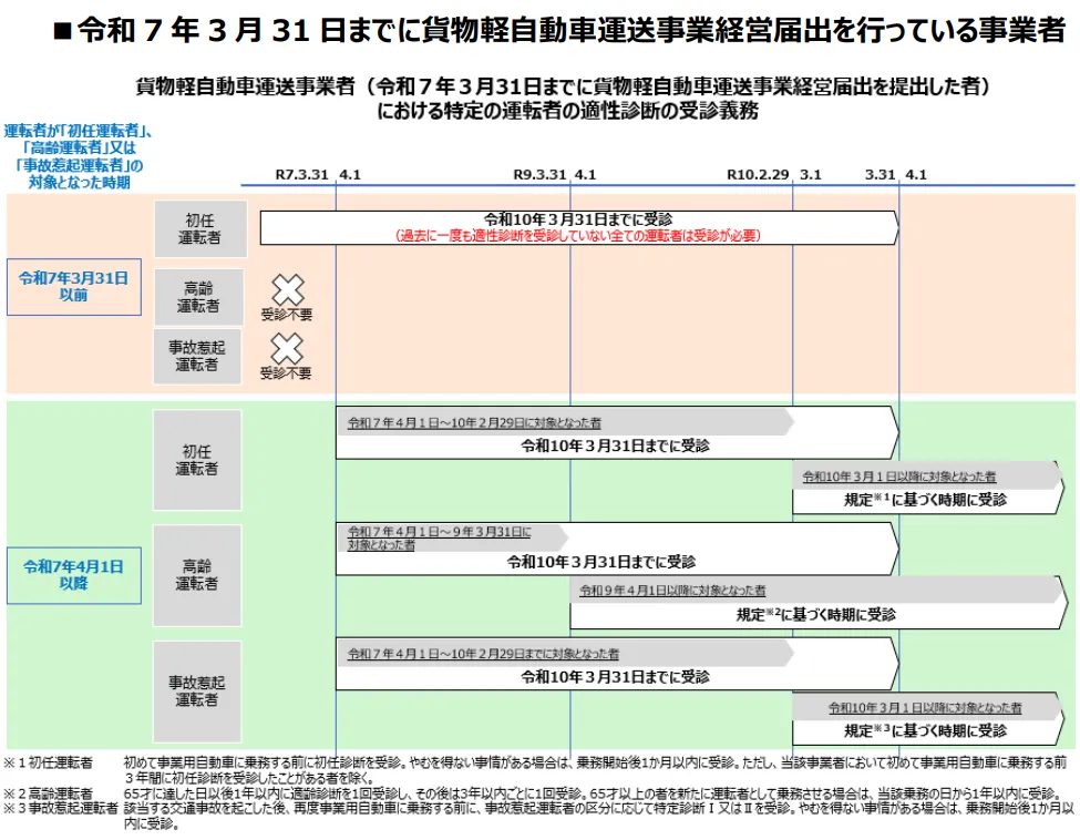 令和7年3月31日までに貨物軽自動車運送届出が済んでいる事業者について、適性診断受診は3年間、指導については2年間の猶予期間が設けられていますが、令和7年4月1日以降に届出をする事業者については、猶予期間は設けられていません。