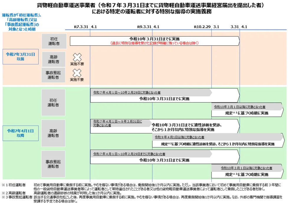 受診時期や指導実施時期については、貨物軽自動車運送経営届出を行った時期や対象となる運転者の種別によって違いますので、注意しましょう。