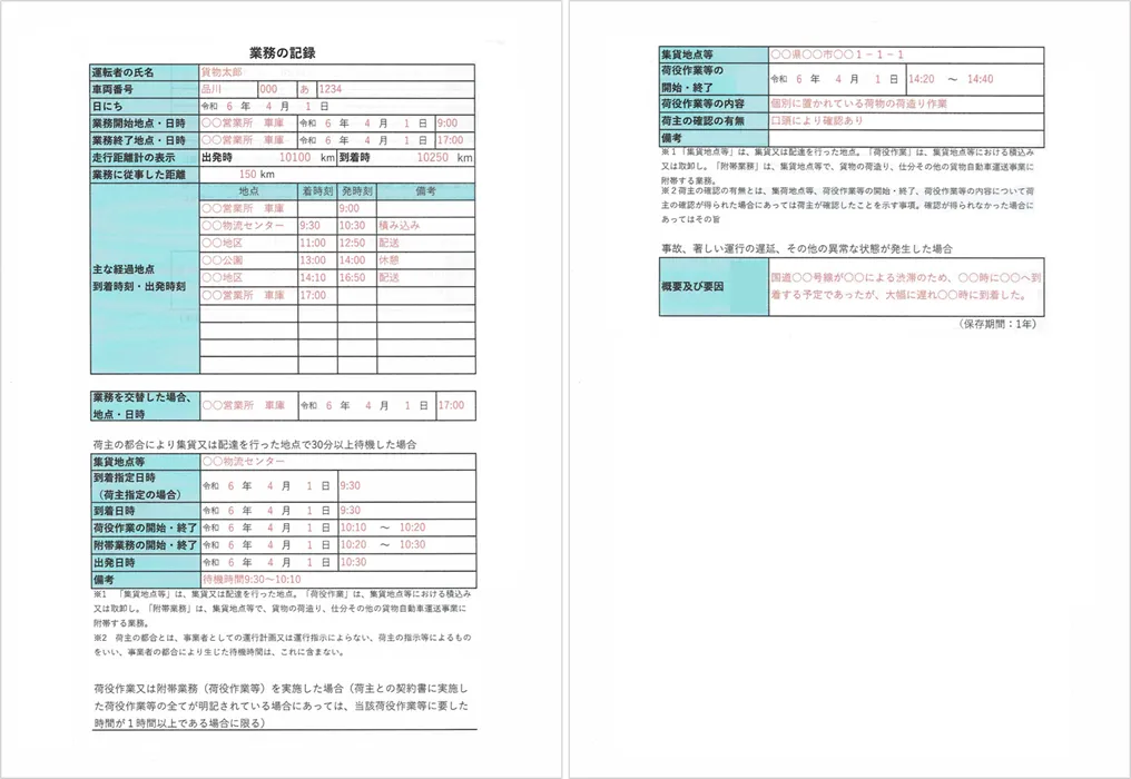- その他、集荷地点等で貨物の荷造り・仕分け等の運送業務に附帯する業務(以下『附帯業務』という。)を行った場合はその開始・終了日時及びその集荷地点等からの出発日時。